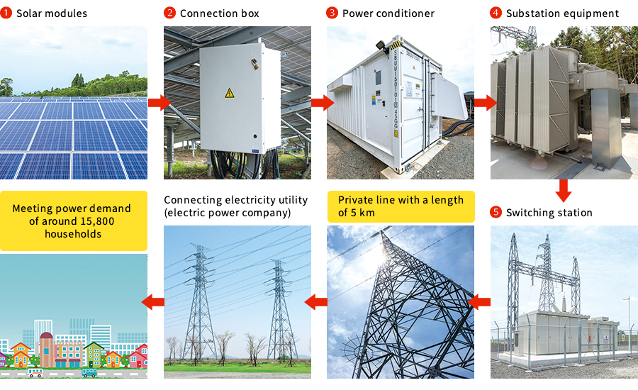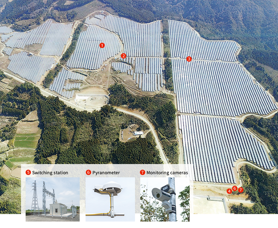 | ❹ Substation equipment | Raises the voltage of electricity converted by the power conditioner into an alternating current to the voltage level on the grid. |